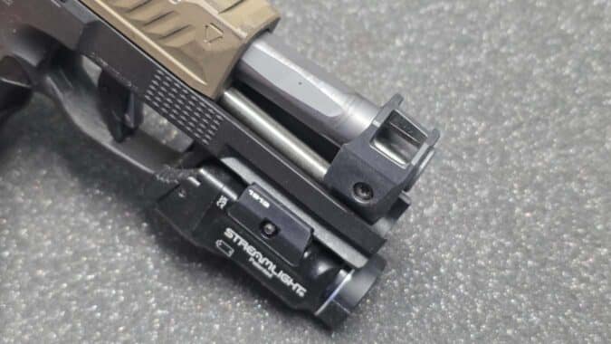 Cool bonus — the Strike slide also comes with two “charging handle” attachments for the rear of the slide. These plastic inserts give you a little something extra to grab onto when racking the slide.